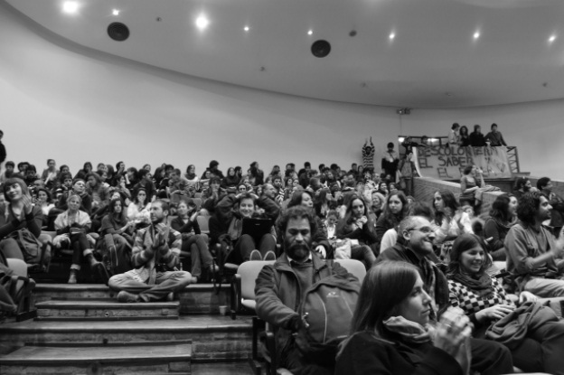 Durante el último día de la X RAM los estudiantes se dirigieron a la conferencia de cierre llevando un cartel que tenía estampada la consigna “descolonizar el saber y el poder”. Fueron recibidos en el escenario por los organizadores del evento y leyeron la declaración de su Asamblea en portugués y castellano. Cientos de copias del documento también fueron distribuidas entre los que participaban de ese acto.