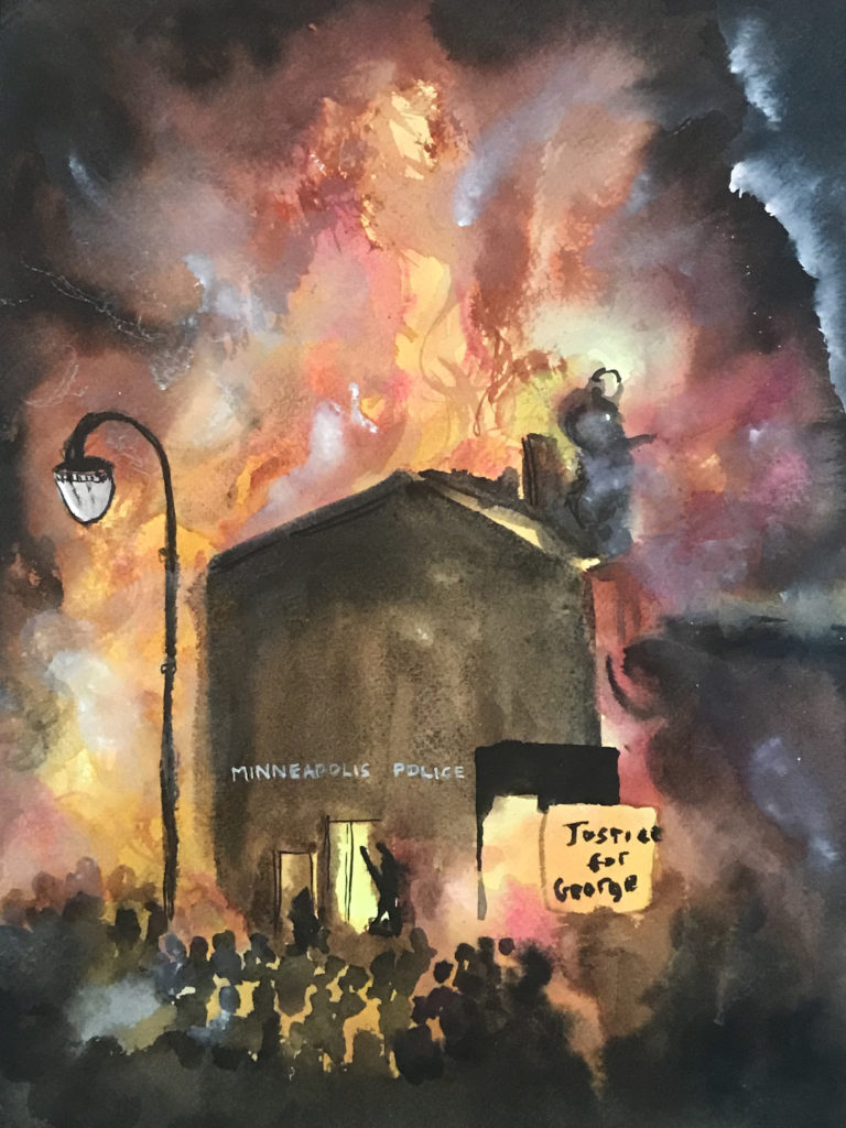 Imagem: Kambui Olujimi, The 3rd Precinct Burns in Minneapolis, 2020.