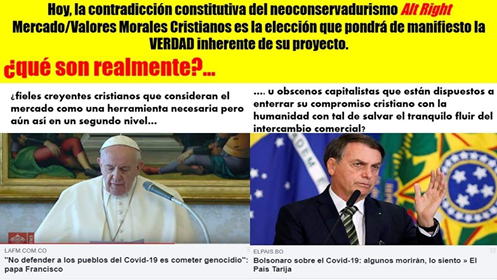 Este sector de neoconservadores creyentes cristianos no representan, por esto, una “regresión” a los principios morales cristianos, por el contrario, todo principio moral está para ellos en segundo nivel cuando éste choca con las lógicas “objetivas” del mercado (no existe la compasión por el humilde, ni solidaridad con el desfavorecido si la “crisis económica” es la que define la necesidad de austeridad del Estado); su cínico pragmatismo realista aplasta sin censura a su defensa moral.
